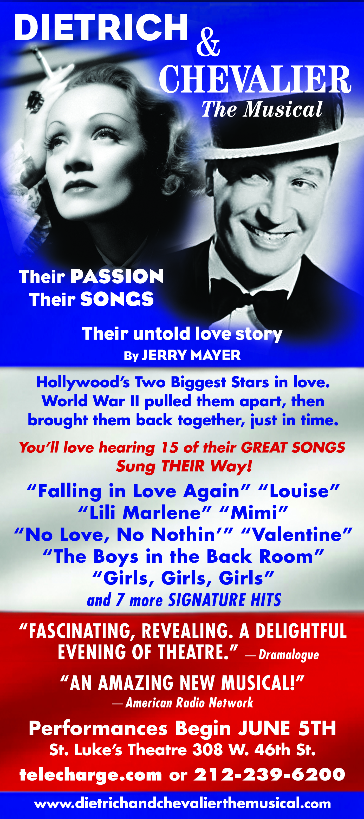 Opened December 10, 2010 at St Lukes Theatre and closed on March 22, 2011 Richard Skipper interspersed stories and jokes from Channing’s life — much of it in her own words — with favorite numbers from her career, from “Before the Parade Passes By” and “Diamonds Are a Girl’s Best Friend” to lesser known novelty tunes such as Ervin Drake’s “Widow’s Weeds.” A talented three-man combo led by musical director John Fischer provides spirited support.